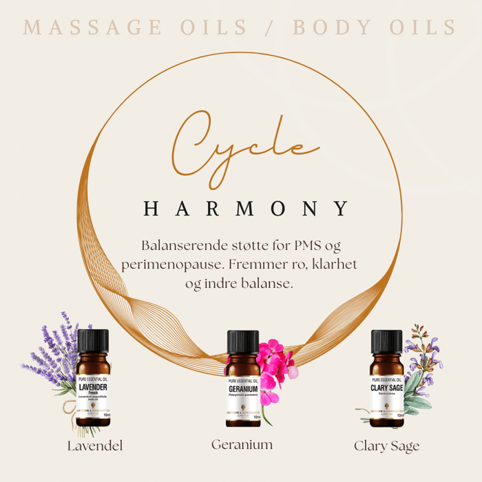 Eteriske oljer kan være en myk og nærende hjelp på veien – små dråper fra naturen som minner oss på balanse, ro og egenomsorg. Når hormonene svinger, kan oljer som clary sage, geranium og lavendel bidra til å stabilisere, løfte og gi klarhet – slik at du kan møte både PMS og perimenopause med større letthet.