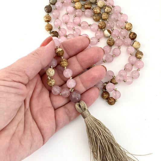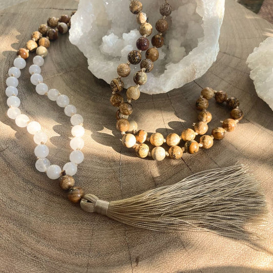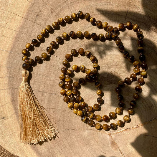 En mala er et kraftfullt verktøy med røtter i gammel visdom. Den består av 108 perler, et symbol på de 108 energipunktene i kroppen – forbindelser mellom det fysiske og det subtile, ifølge ayurvedisk tradisjon. Tradisjonelt brukes malaen i meditasjon, hvor du kan gjenta et mantra og la fingrene vandre perle for perle – en reise innover, pust for pust.