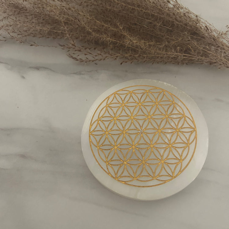 FLOWER OF LIFE Røkelsesholder Selenitt Rund