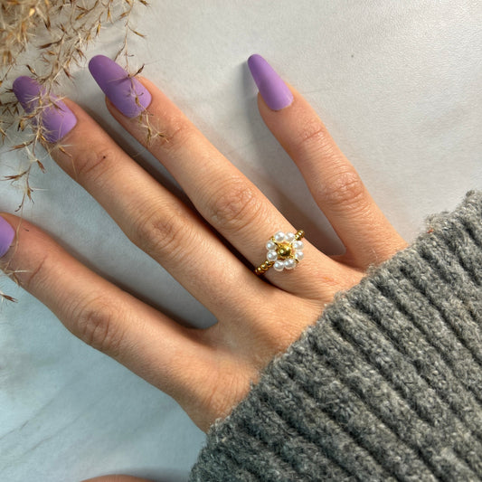 FLOWER Krystall Ring , Justerbar, Hvit perle