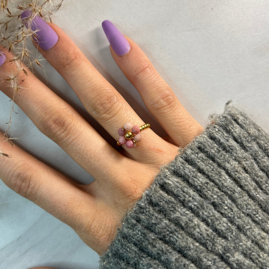FLOWER Krystall Ring, Justerbar, Rosa turmalin