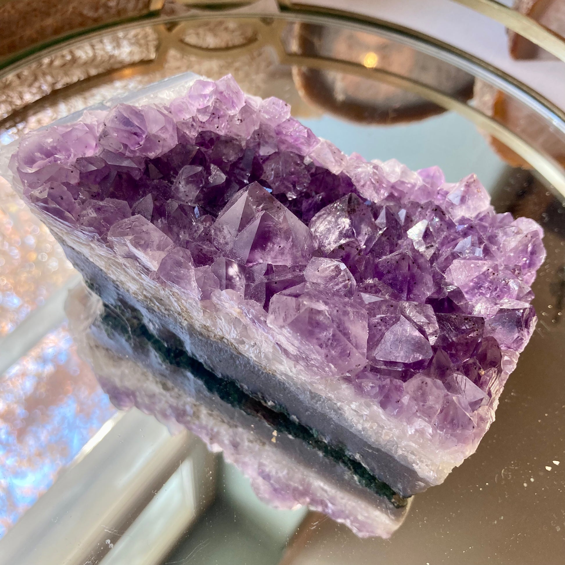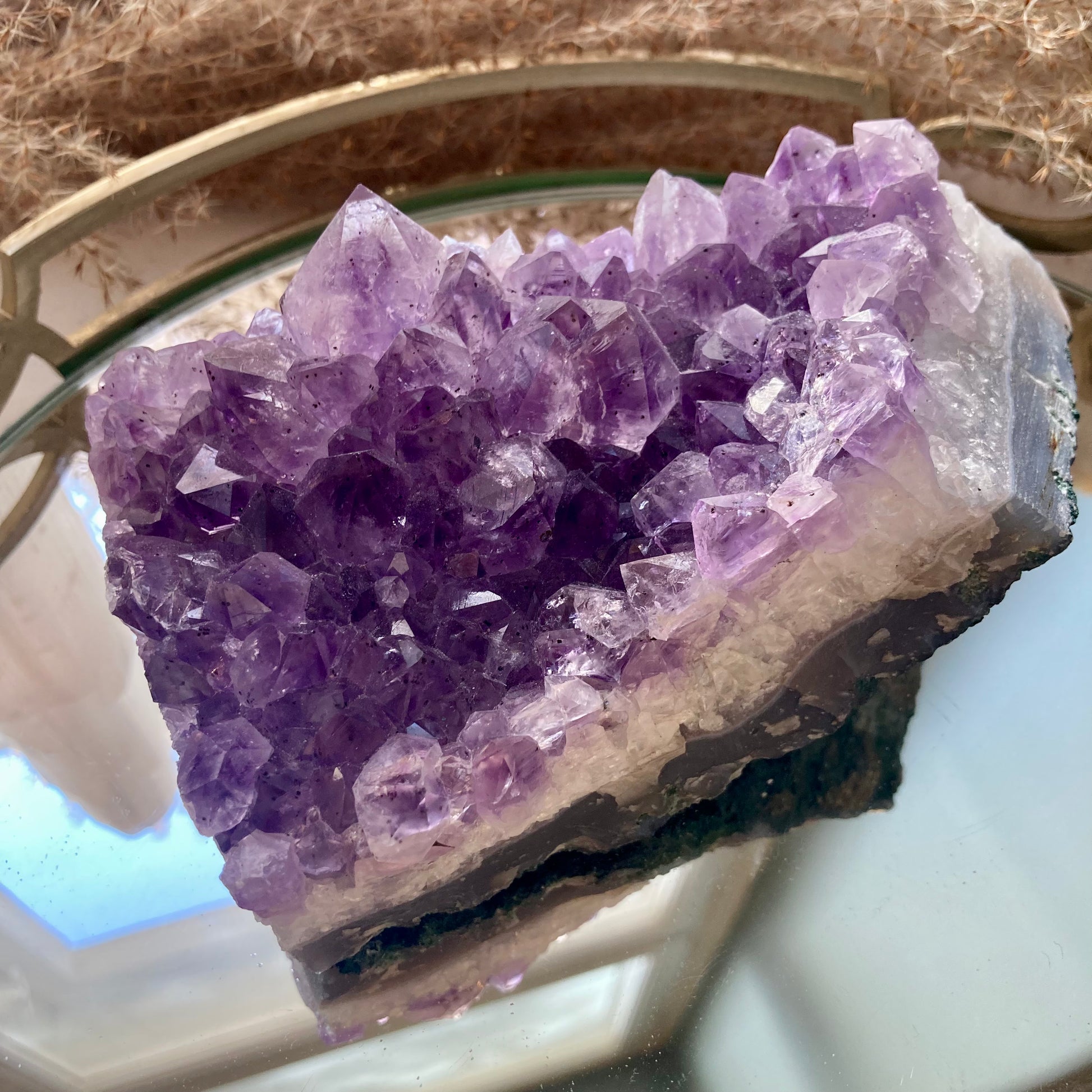 Denne eksklusive ametyst-klyngen utstråler en beroligende, høyfrekvent energi som renser rommet for negativitet og skaper en atmosfære av trygghet og harmoni. Perfekt å plassere i meditasjonshjørnet, soverommet eller et hvilket som helst rom hvor du ønsker ro, balanse og spirituell beskyttelse.
