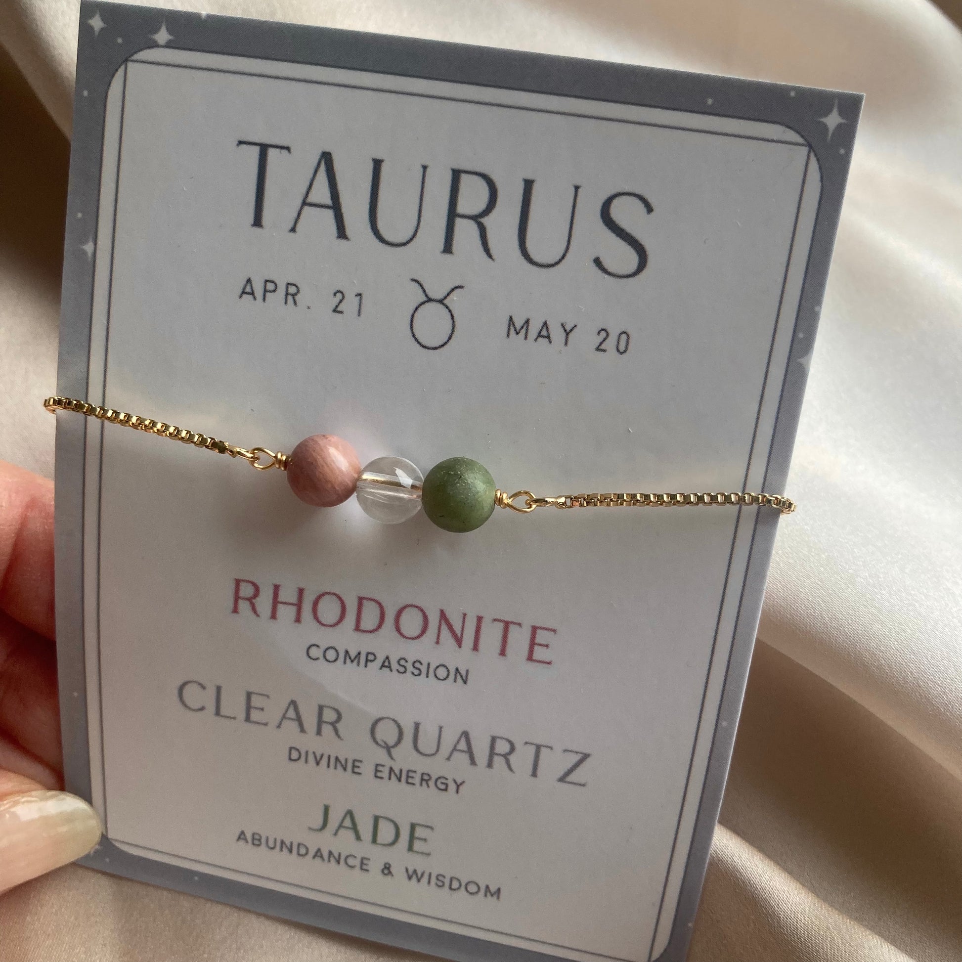 Krystallarmbånd for stjernetegnet tyren kommer med tre utvalgte steiner. Krystallene er valgt ut for å forsterke og støtte personligheten og egenskapene til tyrens tegn.