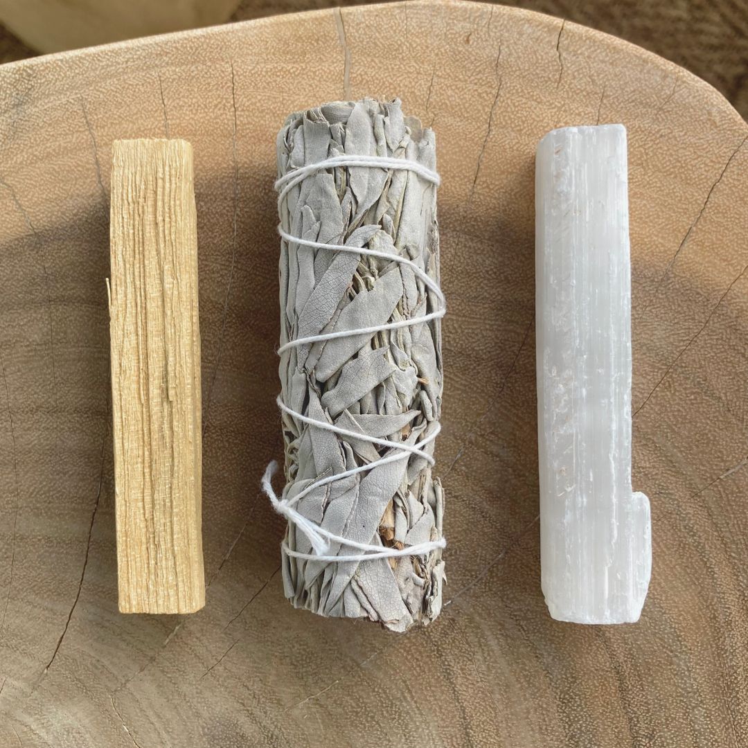 Kitet består av 1 stk Palo Santo Stick, 1 stk Salvie Smudge Stick og en selenittstav.